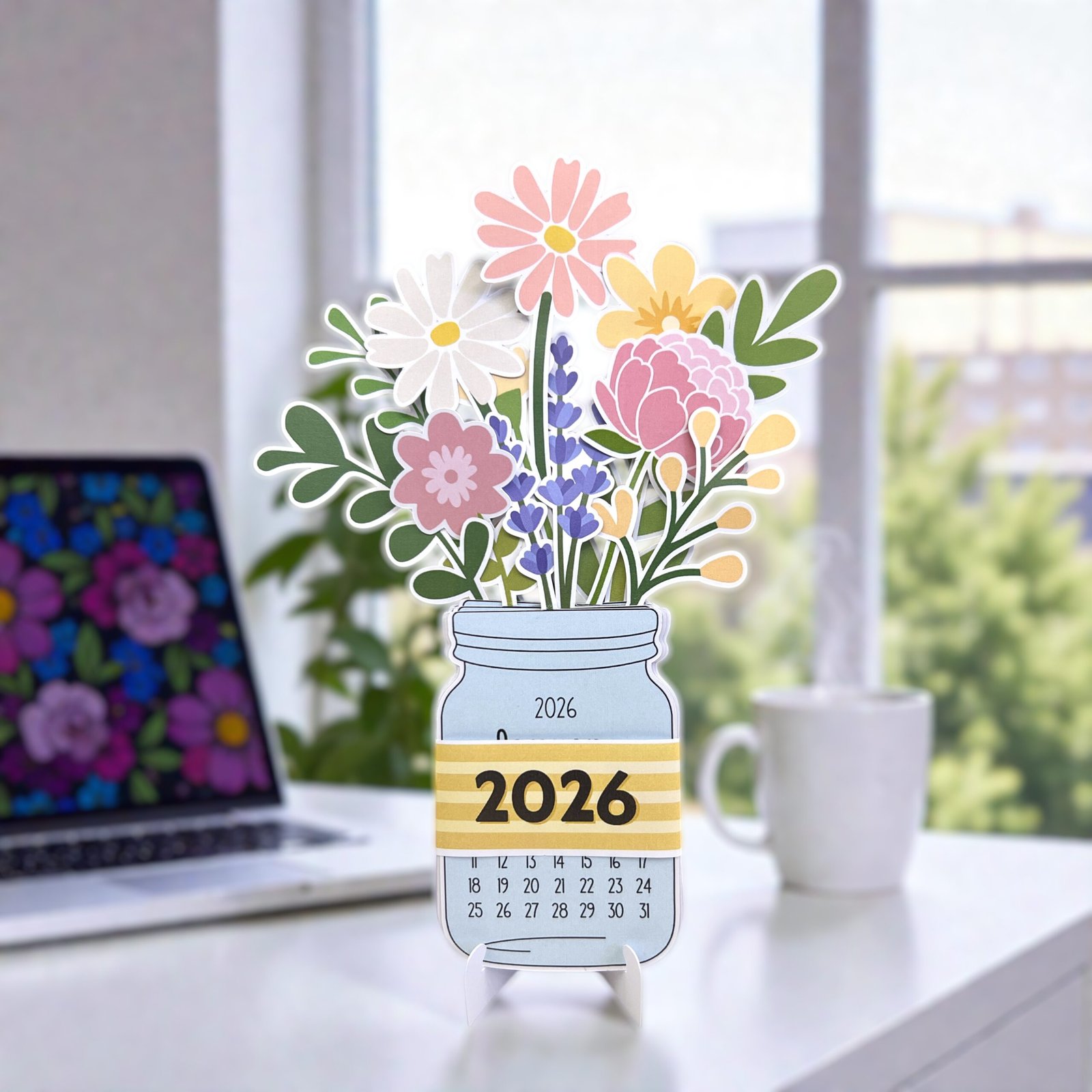 تقويم مكتبي لعام ٢٠٢٦ بتصميم لطيف على شكل باقة زهور